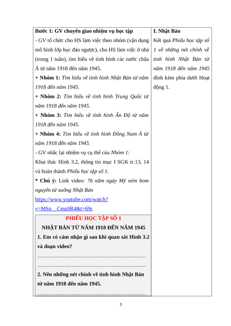 c. Sản phẩm: Phiếu học tập số 1 của HS về những nét chính của tình hình Nhật