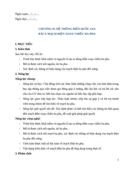 BÀI 3: MẠCH ĐIỆN XOAY CHIỀU BA PHA I. MỤC TIÊU 1. Kiến thức