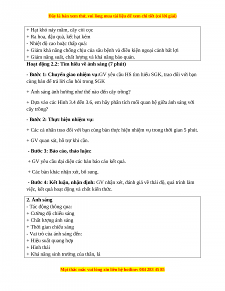 việc, kết quả hoạt động và chốt kiến thức. 2. Ánh sáng - Tác động thông qua: + Cường độ chiếu sáng + Chất lượng ánh sáng + Thời gian chiếu sáng