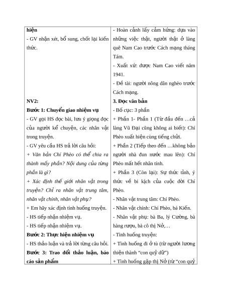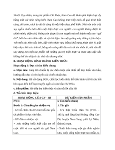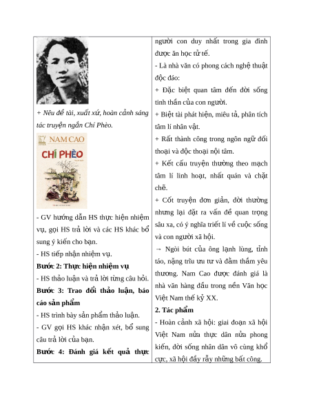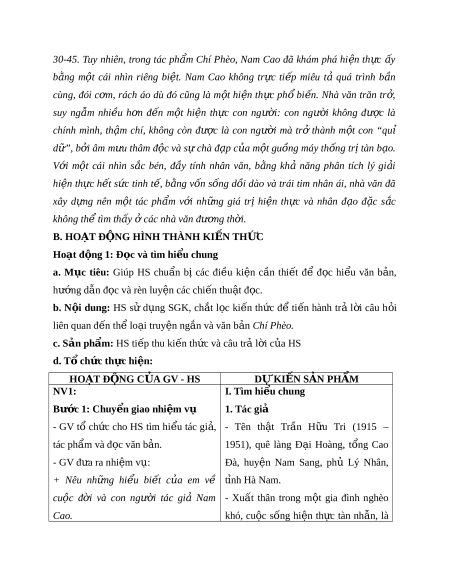 ế cách phân tích, đánh giá m t ộ tác ph m ẩ c a ủ Nam Cao. II. THIẾT B D Ị ẠY H C Ọ VÀ H C Ọ LI U Ệ 1. Chuẩn b c ị a g ủ iáo viên - Giáo án, tài li u t ệ ham kh o, k ả ế ho ch bài ạ d y ạ - Phi u h ế c t ọ p, ậ trả l i ờ câu h i ỏ - B ng ả giao nhi m ệ v cho H ụ S ho t ạ đ ng t ộ rên l p ớ - B ng ả giao nhi m ệ v h ụ c t ọ p ậ cho HS nhà ở 2. Chuẩn b c ị a h ủ c s ọ inh - SGK, SBT Ngữ văn 11, so n ạ bài theo h ệ th ng ố câu h i ỏ hư ng ớ d n ẫ h c ọ bài, vở ghi. III. TI N Ế TRÌNH D Y Ạ H C Ọ A. HOẠT Đ N Ộ G KH I Ở Đ N Ộ G a. M c ụ tiêu: T o ạ tâm th , ế t o ạ h ng