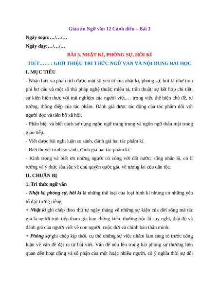 Giáo án Bài 3: Nhật kí, phóng sự, hồi kí Ngữ Văn 12 Cánh diều