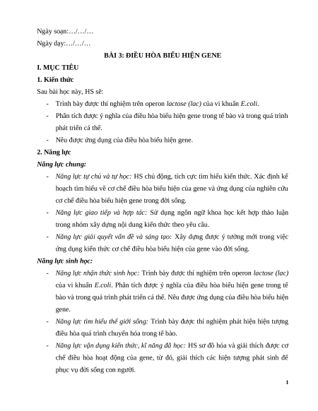 BÀI 3: ĐIỀU HÒA BIỂU HIỆN GENE I. MỤC TIÊU 1. Kiến thức Sau bài học này, HS sẽ: