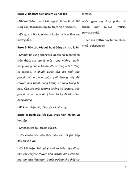 - Năng lực nhận thức sinh học: Trình bày được thí nghiệm trên operon lactose (lac)
