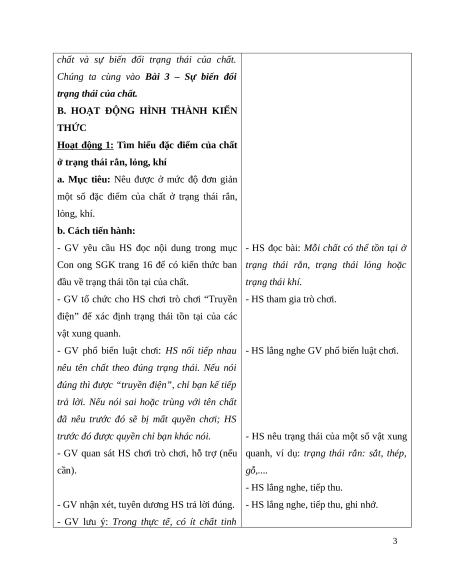 - GV quan sát HS chơi trò chơi, hỗ trợ (nếu quanh, ví dụ: trạng thái rắn: sắt, thép, cần). gỗ,.... - HS lắng nghe, tiếp thu.