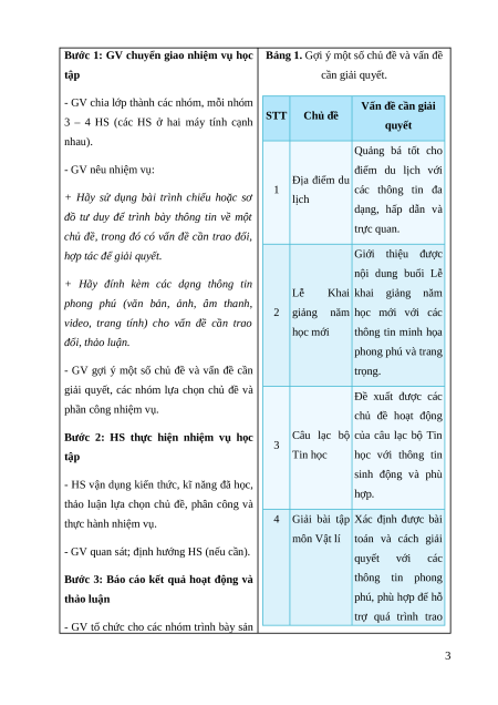 Bước 1: GV chuyển giao nhiệm vụ học Bảng 1. Gợi ý một số chủ đề và vấn đề tập cần giải quyết.