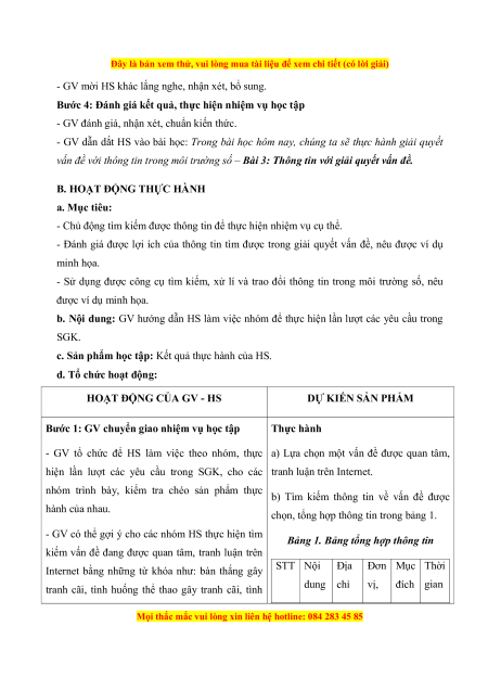 BÀI 3: THÔNG TIN VỚI GIẢI QUYẾT VẤN ĐỀ (1 Tiết) I. MỤC TIÊU 1. Mục tiêu Sau bài học này, HS sẽ: