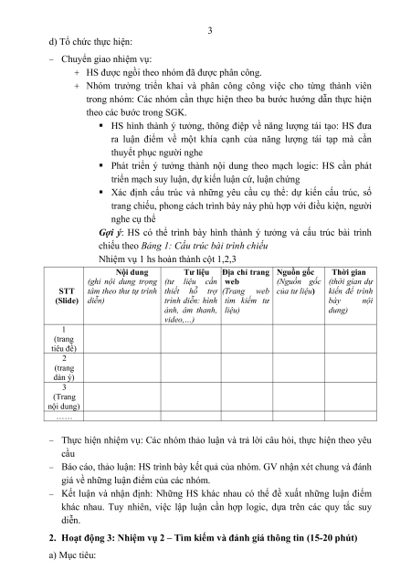 c) Sản phẩm: Ý tưởng và cấu trúc bài trình chiếu. 3 d) Tổ chức thực hiện: