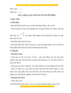 Đây là bản xem th , vu ử i lòng mua tài li u ệ đ xe ể m chi ti t (c ế ó l i ờ gi i ả ) Ngày so n: ạ …/…/… Ngày d y: ạ …/…/… BÀI 3. Đ N Ị H LU T Ậ NEWTON V C Ề HUY N Ể Đ N Ộ G I. M C Ụ TIÊU 1. Ki n t ế h c ứ : - Phát bi u đ ể ịnh lu t ậ Newton và minh ho đ ạ ư c ợ b ng ví ằ d c ụ t ụ h . ể - Từ k t ế qu ả đã có (l y ấ t ừ thí nghi m ệ hay s ử d ng ụ s ố li u ệ cho trư c) ớ , ho c ặ l p ậ F a lu n ậ d a ự vào m , nêu đư c ợ kh i ố lư ng ợ là đ i ạ lư ng ợ đ c ặ tr ng ư cho m c ứ quán tính c a v ủ t ậ . - Phát bi u đ ể ịnh lu t ậ II Newton. - Phát bi u ể đư c ợ đ nh ị lu t ậ III Newton, minh h a ọ đư c ợ b ng ằ ví dụ cụ thể v n ậ d ng đ ụ ư c ợ đ nh l ị u t ậ trong m t ộ s t ố rư ng h ờ p ợ đ n gi ơ n. ả 2. Năng l c ự