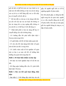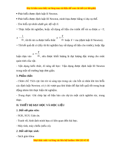 Đây là bản xem th , vu ử i lòng mua tài li u ệ đ xe ể m chi ti t (c ế ó l i ờ gi i ả ) Phát bi u đ ể ư c ợ đ nh l ị u t ậ II Newton. Phát bi u đ ể ư c ợ đ nh l ị u t ậ III Newton, minh h a đ ọ ư c ợ b ng ví ằ d c ụ t ụ h . ể - Tìm hi u t ể nhi ự ên dư i ớ góc đ v ộ t ậ lí: + Th c ự hi n ệ thí nghi m ệ , ho c ặ sử d ng ụ số li u ệ cho trư c ớ để rút ra đư c ợ a ~ F, 1 F a a m , t đó r ừ út ra đư c bi ợ u t ể h c ứ m ho c ặ F = ma (đ nh l ị u t ậ II Newton). + T k ừ t ế qu đã ả có (l y t ấ t ừ hí nghi m ệ hay s d ử ng ụ s l ố i u cho ệ trư c) ớ , ho c ặ l p ậ F a lu n ậ d a ự vào m , nêu đư c ợ kh i ố lư ng ợ là đ i ạ lư ng ợ đ c ặ tr ng ư cho m c ứ quán tính c a v ủ t ậ . - V n ậ d ng ụ ki n ế th c, ứ kĩ năng đã h c: ọ V n ậ d ng ụ đư c ợ đ nh ị lu t ậ III Newton trong m t ộ số trư ng h ờ p ợ đ n gi ơ n. ả 3. Ph m ẩ chất: - Chăm ch : ỉ Tích c c ự tìm tòi và sáng t o ạ trong các câu h i ỏ cá nhân khi tìm hi u ể các đ nh ị lu t ậ Newton; có ý chí vư t ợ qua khó khăn đ ể đ t ạ k t ế qu ả t t ố trong ho t ạ đ ng nhóm ộ khi th c hi ự n t ệ hí nghi m ệ . - Trung th c: ự Ghi chép l i ạ số li u ệ báo cáo dự án m t ộ cách nghiêm túc, trung th c. ự