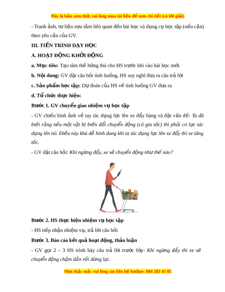 d. Tổ chức thực hi n ệ : Bư c ớ 1. GV chuy n gi ể ao nhi m ệ v h ụ c t ọ p ậ - GV chi u ế hình nh ả về tay tác d ng ụ l c ự lên xe đ y ẩ hàng và đ t ặ v n ấ đ : ề Ta đã bi t ế r ng ằ n u ế m t ộ v t ậ bị bi n ế đ i ổ chuy n ể đ ng ộ (có gia t c) ố thì ph i ả có l c ự tác d ng l ụ ên nó. Đi u này ề khá d hì