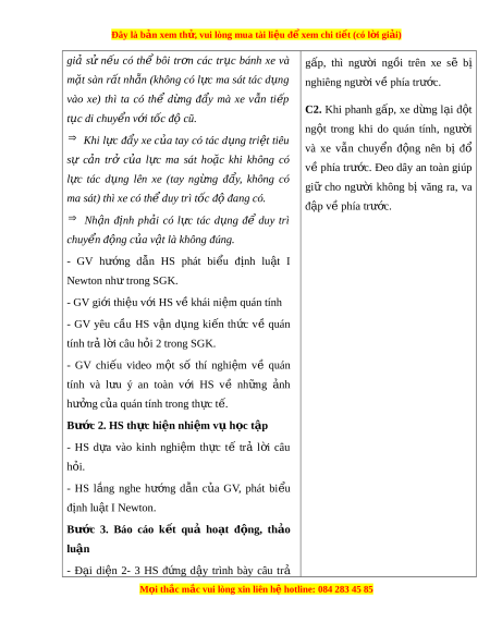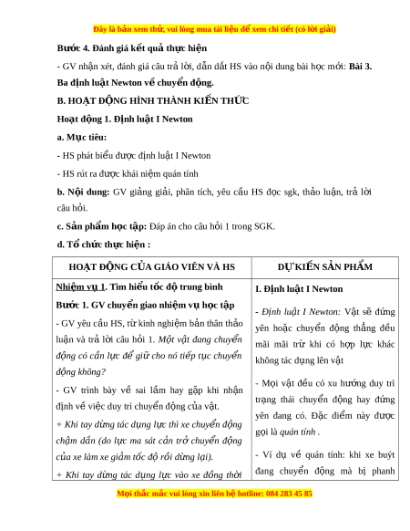 Đây là bản xem th , vu ử i lòng mua tài li u ệ đ xe ể m chi ti t (c ế ó l i ờ gi i ả ) Bư c ớ 4. Đánh giá k t ế qu t ả h c hi ự n ệ - GV nh n ậ xét, đánh giá câu tr ả l i ờ , d n ẫ d t ắ HS vào n i ộ dung bài h c ọ m i ớ : Bài 3. Ba đ nh l ị u t ậ Newton v chuy ề n đ ể ng. ộ B. HO T Ạ Đ N Ộ G HÌNH THÀNH KI N Ế TH C Ứ Hoạt đ ng 1. Đ ộ nh l ị u t ậ I Newton a. Mục tiêu: - HS phát bi u đ ể ư c ợ đ nh l ị u t ậ I Newton - HS rút ra đư c khái ợ ni m ệ quán tính b. N i ộ dung: GV gi ng ả gi i ả , phân tích, yêu c u ầ HS đ c ọ sgk, th o ả lu n, ậ trả l i ờ câu h i ỏ . c. S n ph ả m ẩ h c ọ t p: