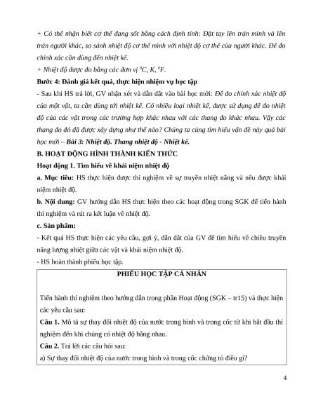 thí nghiệm và rút ra kết luận về nhiệt độ. c. Sản phẩm: