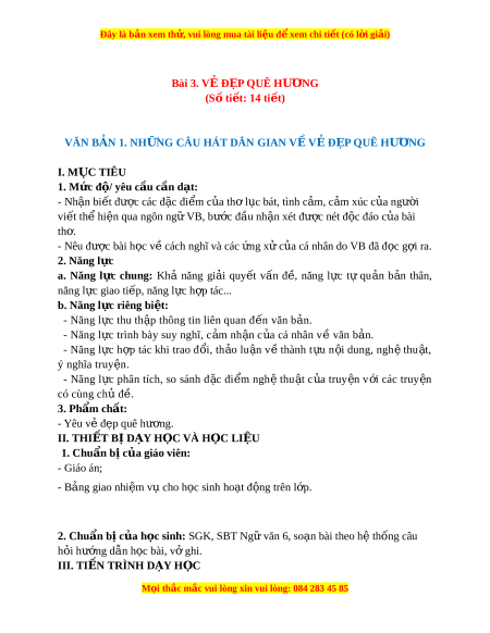 Ữ G CÂU HÁT DÂN GIAN V Ề V Đ Ẻ P Ẹ QUÊ HƯ N Ơ G I. M C Ụ TIÊU 1. Mức đ / ộ yêu c u c ầ n d ầ t ạ : - Nh n bi ậ t ế đư c ợ các đ c ặ đi m ể c a ủ th l ơ c bát ụ , tình c m ả , c m ả xúc c a ủ ngư i ờ vi t ế th hi ể n qua ngôn ng ệ ữ VB, bư c ớ đ u nh ầ n xét ậ đư c ợ nét đ c đáo ộ c a bài ủ th . ơ - Nêu đư c ợ bài h c v ọ cách ề nghĩ và các ng ứ x c ử a cá ủ nhân do VB đã đ c g ọ i ợ ra. 2. Năng l c ự a. Năng l c