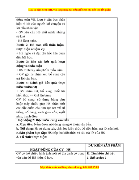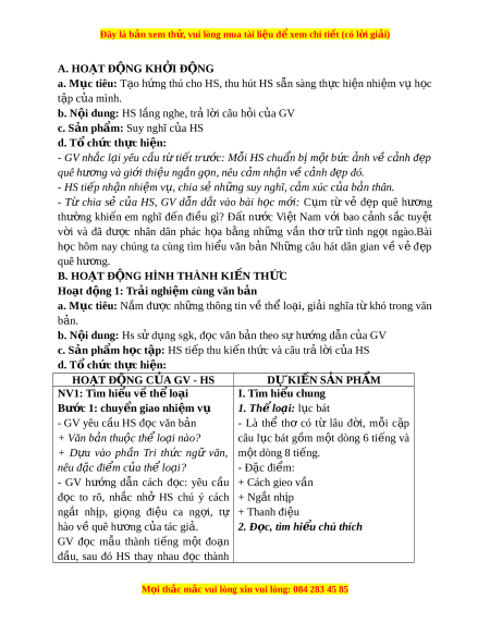Đây là bản xem th , vu ử i lòng mua tài li u ệ đ xe ể m chi ti t ế (có l i ờ gi i ả ) ti ng ế toàn VB. L u ư ý c n ầ đ c ọ phân bi t ệ rõ l i ờ c a ủ ngư i ờ kể chuy n ệ và l i ờ c a nhân ủ v t ậ . - GV yêu c u ầ HS gi i ả nghĩa nh ng ữ t khó ừ - HS l ng ắ nghe. Bư c ớ 2: HS trao đ i ổ th o ả lu n, ậ thực hi n n ệ hi m ệ vụ + HS nghe và đ t ặ câu h i ỏ liên quan đ n bài ế h c. ọ Bư c ớ 3: Báo cáo k t ế quả ho t ạ đ ng và t ộ hảo lu n ậ + HS trình bày s n ả ph m ẩ th o l ả u n ậ . + GV g i ọ hs nh n ậ xét, bổ sung câu trả l i ờ c a b ủ n. ạ Bư c ớ 4: Đánh giá k t ế quả th c ự hi n nhi ệ m ệ vụ + GV nh n ậ xét, bổ sung, ch t ố l i ạ ki n t ế h c => G ứ hi lên b ng ả GV bổ sung: sử d ng ụ b ng ả phụ ho c ặ máy chi u ế giúp HS nh n ậ bi t ế các đ c ặ đi m ể c u ả thơ l c ụ bát về số ti ng, ế số dòng, cách gieo v n, ầ ng t ắ nhịp, thanh đi u. ệ Hoạt đ ng 2 ộ : Đ c ọ hi u cù ể ng văn b n ả a. Mục tiêu: N m ắ đư c n ợ i ộ dung và ngh t ệ hu t ậ văn b n. ả b. N i