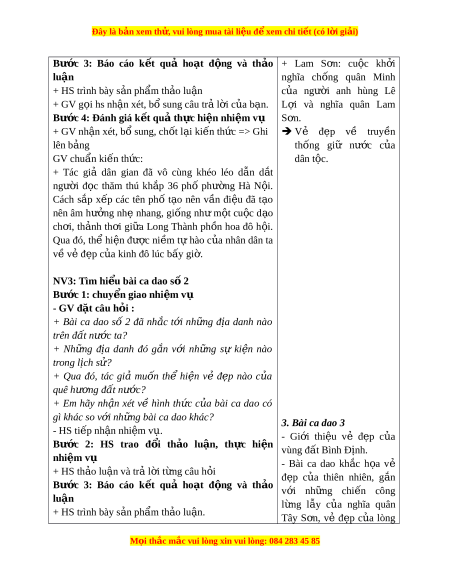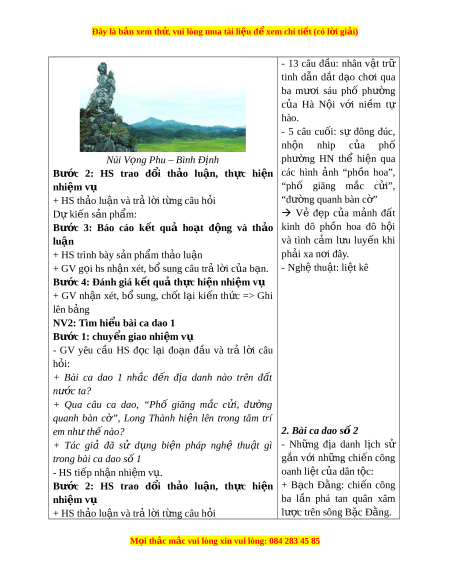 Đây là bản xem th , vu ử i lòng mua tài li u ệ đ xe ể m chi ti t ế (có l i ờ gi i ả ) - 13 câu đ u: ầ nhân v t ậ trữ tinh d n ẫ d t ắ d o ạ ch i ơ qua ba mư i ơ sáu phố phư ng ờ c a ủ Hà N i ộ v i ớ ni m ề tư hào. - 5 câu cu i ố : sư đông đúc, nh n ộ nhip c a ủ phố Núi V ng P ọ hu – Bình Đ nh ị phư ng ờ HN thể hi n ệ qua Bư c ớ 2: HS trao đ i ổ th o ả lu n, ậ th c ự hi n ệ các hình nh ả “ph n ồ hoa”, nhi m ệ vụ “phố giăng m c ắ c i ử ”, + HS th o l ả u n và ậ tr l ả i ờ t ng câu h ừ i ỏ “đư ng ờ quanh bàn c ” ờ D ki ư n s ế n ph ả ẩm: Vẻ đ p ẹ c a ủ m nh ả đ t â Bư c ớ 3: Báo cáo k t ế quả ho t ạ đ ng ộ và th o ả kinh đô ph n ồ hoa đô h i ộ luận và tình c m ả l u ư luy n ế khi + HS trình bày s n ph ả m ẩ th o l ả u n ậ ph i ả xa n i ơ đây. + GV g i ọ hs nh n ậ xét, b s ổ ung câu tr l ả i ờ c a ủ b n. ạ - Ngh t ệ hu t ậ : li t ệ kê Bư c ớ 4: Đánh giá k t ế qu t ả h c hi ự n n ệ hi m ệ vụ + GV nh n ậ xét, bổ sung, ch t ố l i ạ ki n ế th c ứ => Ghi lên b ng ả NV2: Tìm hi u ể bài ca dao 1 Bư c ớ 1: chuy n gi ể ao nhi m ệ vụ - GV yêu c u ầ HS đ c ọ l i ạ đo n ạ đ u ầ và trả l i ờ câu h i ỏ : + Bài ca dao 1 nh c ắ đ n ế đ a