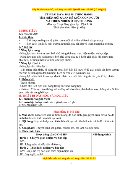 Giáo án Bài 30 Địa lí 6 Kết nối tri thức (2024): Thực hành Tìm hiểu mối quan hệ giữa con người và thiên nhiên ở địa phương