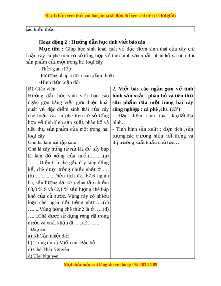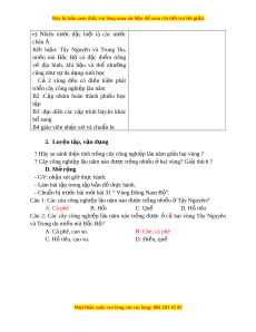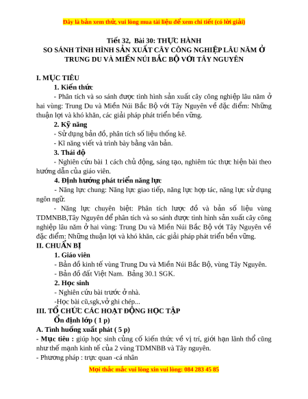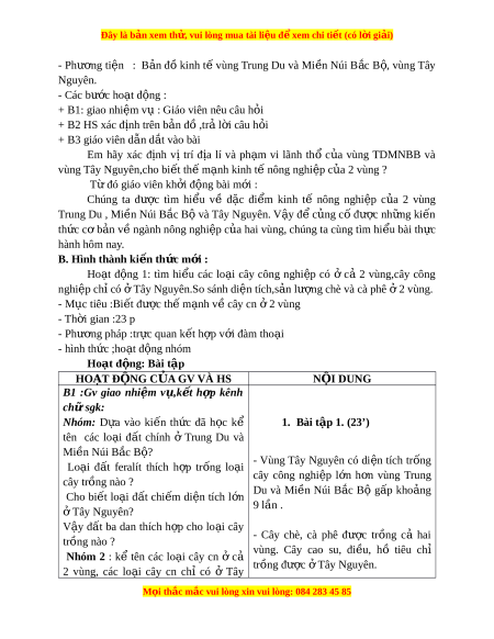 Đây là bản xem th , vu ử i lòng mua tài li u ệ đ xe ể m chi ti t (c ế ó l i ờ gi i ả ) - Phư ng ơ ti n ệ : B n ả đ ồ kinh t ế vùng Trung Du và Mi n ề Núi B c ắ B , ộ vùng Tây Nguyên. - Các bư c ho ớ t ạ đ ng : ộ + B1: giao nhi m ệ v : ụ Giáo viên nêu câu h i ỏ + B2 HS xác đ nh t ị rên b n ả đ ,t ồ r l ả i ờ câu h i ỏ + B3 giáo viên d n d ẫ t ắ vào bài Em hãy xác đ nh ị vị trí đ a ị lí và ph m ạ vi lãnh thổ c a ủ vùng TDMNBB và vùng Tây Nguyên,cho bi t ế th m ế nh ki ạ nh t nông nghi ế p c ệ a ủ 2 vùng ? T đó gi ừ áo viên kh i ở đ ng bài ộ m i ớ : Chúng ta đư c ợ tìm hi u ể về đ c ặ đi m ể kinh tế nông nghi p ệ c a ủ 2 vùng Trung Du , Mi n ề Núi B c ắ B và ộ Tây Nguyên. V y ậ đ ể c ng ủ c ố đư c ợ nh ng ữ ki n ế th c ứ c ơ b n ả v ề ngành nông nghi p c ệ a