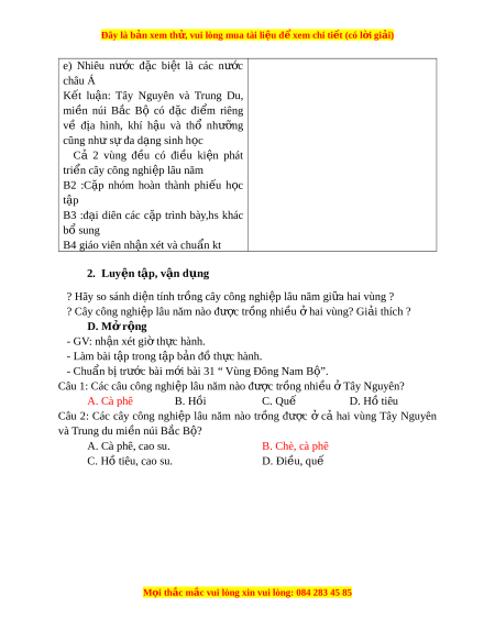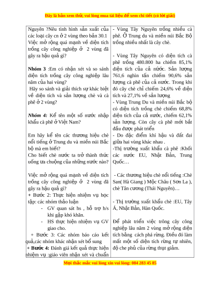 Đây là bản xem th , vu ử i lòng mua tài li u ệ đ xe ể m chi ti t (c ế ó l i ờ gi i ả ) Nguyên ?Nêu tình hình s n ả xu t ấ c a ủ - Vùng Tây Nguyên tr ng ồ nhi u ề cà các lo i ạ cây cn 2 vùng t ở heo b n 30.1 ả phê. Ở Trung du và mi n ề núi B c ắ Bộ Việc mở r ng ộ quá m nh ạ về di n ệ tích trồng nhi u nh ề ất là cây chè. trồng cây công nghi p ệ ở 2 vùng đã gây ra h u ậ qu gì ả ? - Vùng Tây Nguyên có di n ệ tích cà phê trồng 480.800 ha chi m ế 85,1% Nhóm 3 :Em có nh n