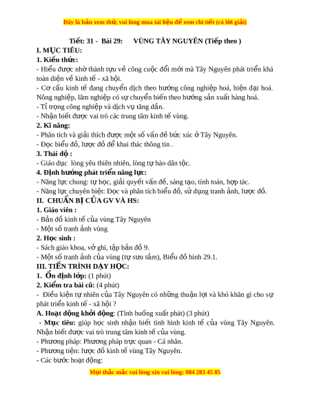 òng yêu thiên nhiên, lòng tự hào dân t c. ộ 4. Đ nh h ị ư ng phá ớ t tri n năng l ể c: ự - Năng l c chung: ự tự h c, gi ọ i ả quy t ế v n đ ấ , s ề áng t o, t ạ ính toán, h p ợ tác. - Năng l c chuyên ự bi t ệ : Đ c ọ và phân tích bi u đ ể , s ồ ử d ng t ụ ranh nh, ả lư c đ ợ . ồ II. CHUẨN BỊ C A Ủ GV VÀ HS: 1. Giáo viên : - B n ả đồ kinh t c ế a ủ vùng Tây Nguyên - M t ộ số tranh nh ả vùng 2. H c ọ sinh :