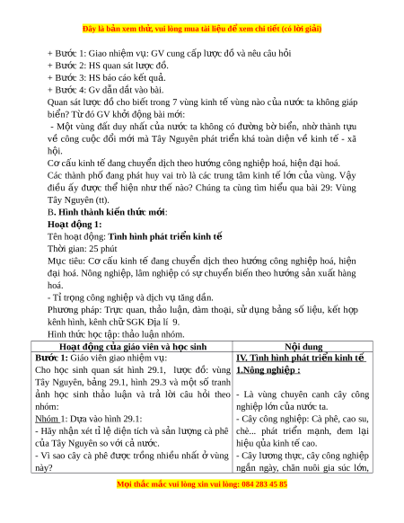 ế tình hình kinh tế c a ủ vùng Tây Nguyên. Nh n ậ bi t ế đư c vai ợ trò trung tâm kinh t c ế a vùng. ủ - Phư ng pháp: ơ Phư ng pháp ơ tr c quan ự - Cá nhân. - Phư ng t ơ i n: ệ lư c đ ợ ki ồ nh t vùng ế Tây Nguyên. - Các bư c ho ớ t ạ đ ng: ộ M i ọ thắc m c