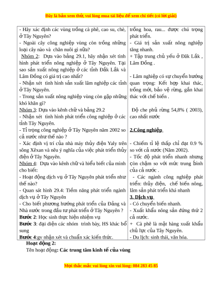 ể như - Các ngành công nghi p ệ phát th nào? ế tri n: ể th y ủ đi n, ệ chế bi n ế nông, - Quan sát hình 29.4: Ti m ề năng phát tri n ể ngành lâm s n phát ả tri n khá nhanh ể dịch v ụ ở Tây Nguyên 3. D ch ị v ụ - Cho bi t ế phư ng ơ hư ng ớ phát tri n ể c a ủ Đ ng ả và - Có chuy n ể bi n nhanh. ế Nhà nư c ớ trong đ u t ầ phát ư tri n ể ở Tây Nguyên ? - Xu t ấ kh u ẩ nông s n ả đ ng ứ thứ 2 Bư c ớ 2: H c s ọ inh th c hi ự n nhi ệ m ệ vụ cả nư c. ớ Bư c ớ 3: đ i ạ di n