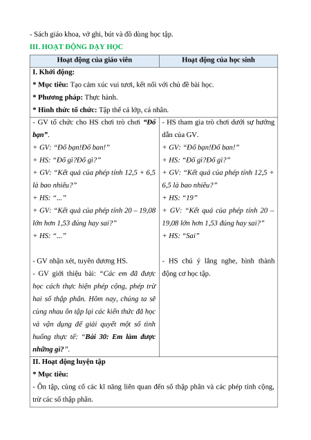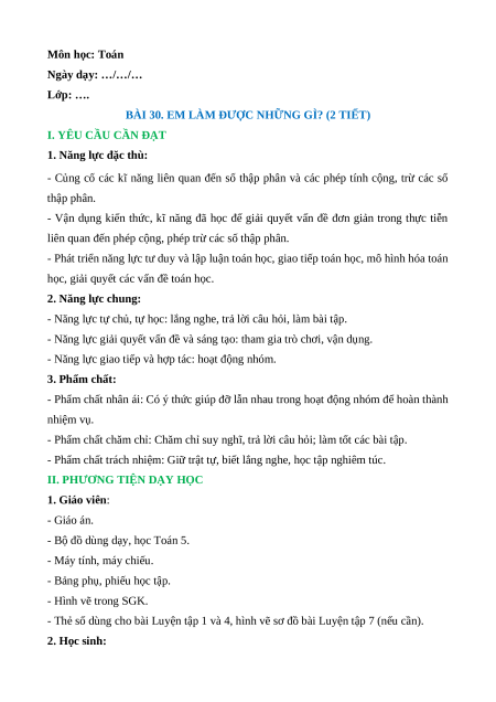Giáo án Bài 30: Em làm được những gì? Toán lớp 5 Chân trời sáng tạo