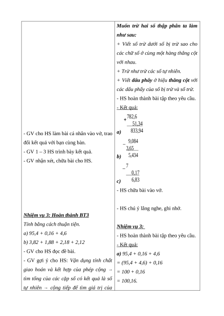 - HS hoàn thành bài tập theo yêu cầu. - Kết quả: +782,6 51,34 833,94