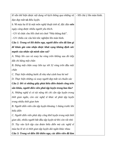 - GV nhận xét, đánh giá và khích lệ HS: Nghệ thuật múa