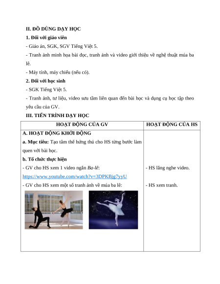 Giáo án Bài 30: Nghệ thuật múa ba lê Tiếng Việt lớp 5 Kết nối tri thức