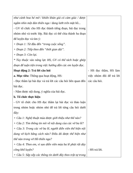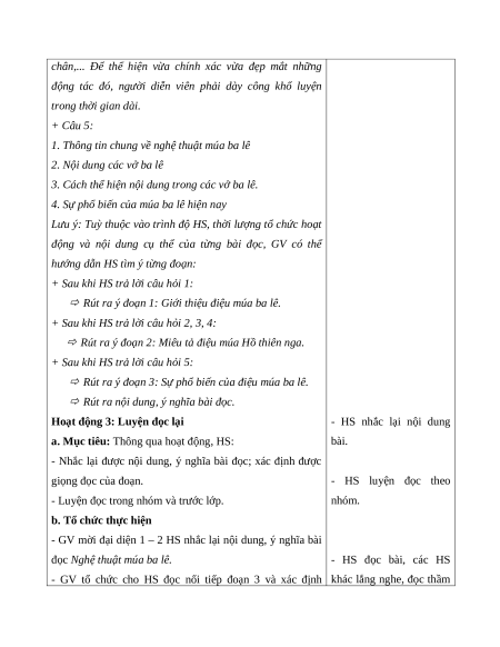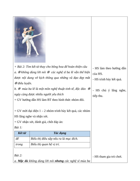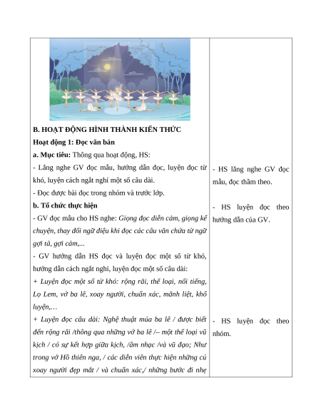 - Đọc đúng từ ngữ, câu, đoạn và toàn bộ bài Nghệ thuật múa ba lê. Biết đọc diễn