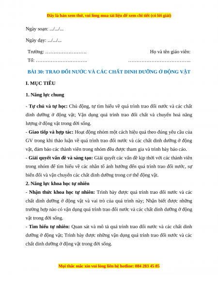 BÀI 30: TRAO ĐỔI NƯỚC VÀ CÁC CHẤT DINH DƯỠNG Ở ĐỘNG VẬT I. MỤC TIÊU 1. Năng lực chung