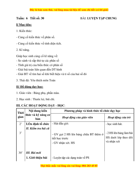 Tuần: 6 Tiết số: 30 BÀI: LUYỆN TẬP CHUNG I/ Mục tiêu: 1. Kiến thức: