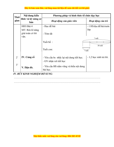 - 1 HS đọc đề bài trước MT: Rèn kĩ năng lớp giải toán có lời - Tóm tắt văn. ? tuổi Tuổi bố : 30 tuổi Tuổi con: ? tuổi 2’ IV. Củng cố