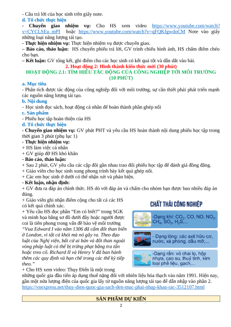 - Giáo án, 1 số video, tranh ảnh minh họa cho tác động của công nghiệp đối với môi trường, các