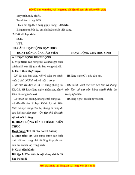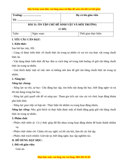 BÀI 31: ÔN TẬP CHỦ ĐỀ SINH VẬT VÀ MÔI TRƯỜNG (1 tiết) Tuần: Ngày soạn: Thời gian thực hiện: I. YÊU CẦU CẦN ĐẠT: 1. Kiến thức: Sau bài học này, HS: