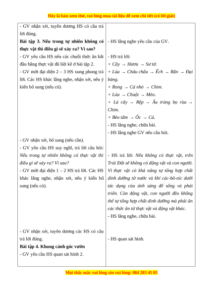 - Củng cố được kiến thức về chuỗi thức ăn trong tự nhiên và vai trò của thực vật trong chuỗi thức ăn.