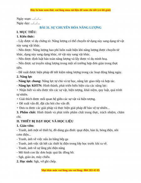 BÀI 31. SỰ CHUYỂN HÓA NĂNG LƯỢNG I. MỤC TIÊU: 1. Kiến thức: