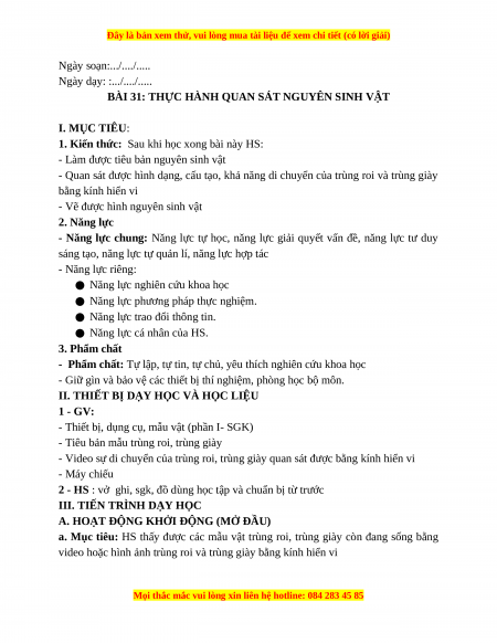 BÀI 31: THỰC HÀNH QUAN SÁT NGUYÊN SINH VẬT I. MỤC TIÊU: