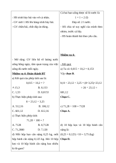 0,25 l. Hỏi cả hai bạn đã uống bao nhiêu Chi uống được số lít nước là: lít nước? 0,2 × 5 = 1 (l)