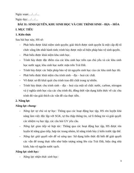 BÀI 31: SINH QUYỂN, KHU SINH HỌC VÀ CHU TRÌNH SINH – ĐỊA – HÓA I. MỤC TIÊU 1. Kiến thức Sau bài học này, HS sẽ: