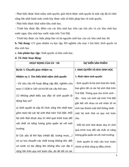 Hoạt động 1: Tìm hiểu về sinh quyển và khu sinh học a. Mục tiêu: 4