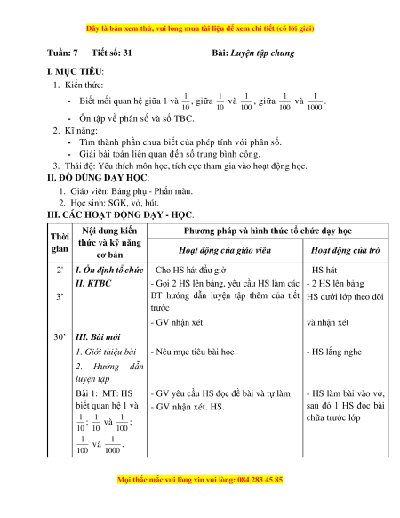 Tuần: 7 Tiết số: 31 Bài: Luyện tập chung I. MỤC TIÊU: 1. Kiến thức: 1 1 1 1 1
