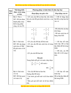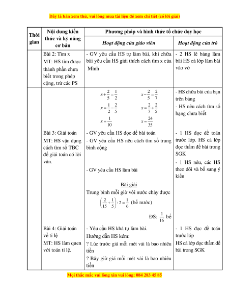 MT: HS tìm được bài yêu cầu HS giải thích cách tìm x của bài HS cả lớp làm bài thành phần chưa Mình vào vở biết trong phép cộng, trừ các PS 2 1 2 2 - HS chữa bài của bạn x + = x − = 5 2 5 7 trên bảng 1 2 2 2 x = − x = + - HS nêu cách tìm số 2 5 7 5 hạng chưa biết 1 24 x = x = 10 35 Bài 3: Giải toán