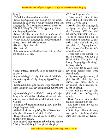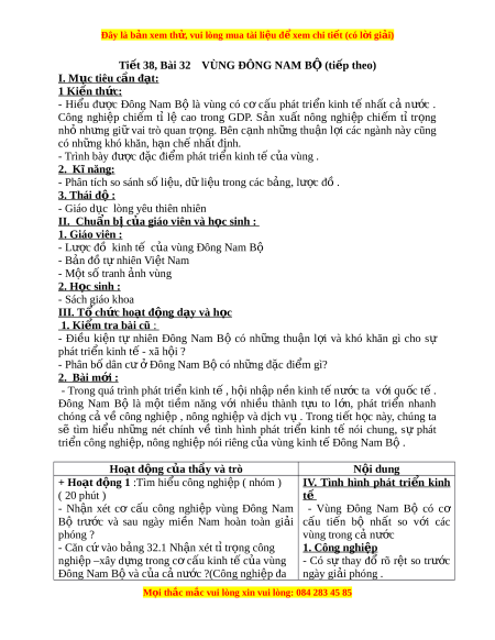ế tỉ lệ cao trong GDP. S n ả xu t ấ nông nghi p ệ chi m ế tỉ tr ng ọ nhỏ nh ng ư giữ vai trò quan tr ng. ọ Bên c nh ạ nh ng ữ thu n ậ l i ợ các ngành này cũng có nh ng ữ khó khăn, h n ch ạ ế nhất đ nh. ị - Trình bày đư c đ ợ c ặ đi m ể phát tri n ể kinh tế c a vùng . ủ 2. Kĩ năng: - Phân tích so sánh s l ố i u, d ệ l ữ i u t ệ rong các b ng, l ả ư c ợ đ . ồ 3. Thái đ : ộ - Giáo d c l ụ òng yêu thiên nhiên II. Chu n b ẩ c ị a g ủ iáo viên và h c ọ sinh : 1. Giáo viên : - Lư c đ ợ ồ kinh t c ế a vùng Đ ủ ông Nam Bộ - B n ả đồ tự nhiên Vi t ệ Nam - M t ộ số tranh nh ả vùng 2. H c ọ sinh : - Sách giáo khoa III. T ch ổ ức ho t ạ đ ng d ộ y và h ạ c ọ 1. K i m