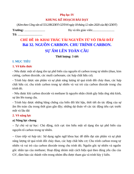 Giáo án Bài 32 KHTN 9 Cánh Diều (2024): Nguồn carbon. Chu trình carbon. Sự ấm lên toàn cầu