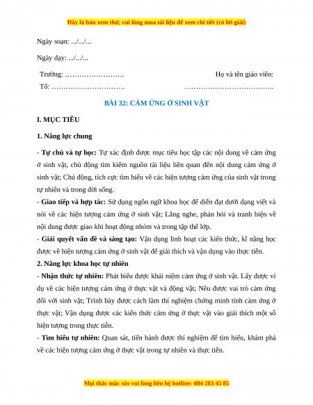 BÀI 32: CẢM ỨNG Ở SINH VẬT I. MỤC TIÊU 1. Năng lực chung
