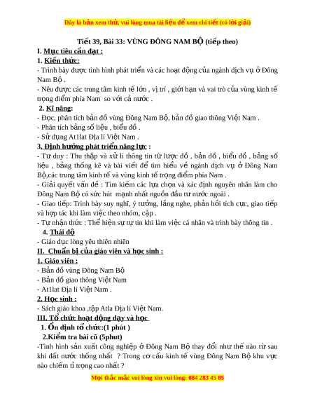 I. Mục tiêu cần đ t ạ : 1. Ki n t ế h c: ứ - Trình bày đư c t ợ ình hình phát tri n ể và các ho t ạ đ ng c ộ a ngành ủ d ch ị v ụ Đ ở ông Nam B . ộ - Nêu đư c ợ các trung tâm kinh t l ế n , v ớ t ị rí , gi i ớ h n ạ và vai trò c a ủ vùng kinh tế tr ng đi ọ m ể phía Nam so v i ớ c n ả ư c . ớ 2. Kĩ năng: - Đ c, phân ọ tích b n đ ả vùng Đ ồ ông Nam B , ộ b n đ ả gi ồ ao thông Vi t ệ Nam . - Phân tích b ng s ả ố li u , bi ệ u đ ể . ồ - S d ử ng ụ At1lat Đ a l ị í Vi t ệ Nam . 3. Đ nh h ị ư ng phá ớ t tri n năng l ể c ự : - Tư duy : Thu th p