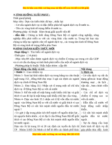 ằ Đông Nam Bộ có ngành công nghi p, ệ nông nghiệp đ u ề phát tri n ể so v i ớ các vùng khác c a ủ nư c ớ ta. Trong bài h c ọ này chúng ta ti p ế t c ụ nghiên c u ứ v ngành ề d ch ị v ụ , các trung tâm kinh t ế Đông Nam Bộ và vùng kinh t t ế r ng đi ọ m ể phía Nam B.HÌNH THÀNH KI N Ế TH C Ứ M I Ớ Hoạt đ ng 1 ộ : Tìm hi u ể v ngành d ề ch v ị ụ -Th i ờ gian ( 14 phút) -M c ụ tiêu:HS n m ắ đư c ợ ngành d ch ị vụ chi m ế tỉ tr ng ọ cao trong cơ c u ấ GDP và có c c ơ ấu đa d ng
