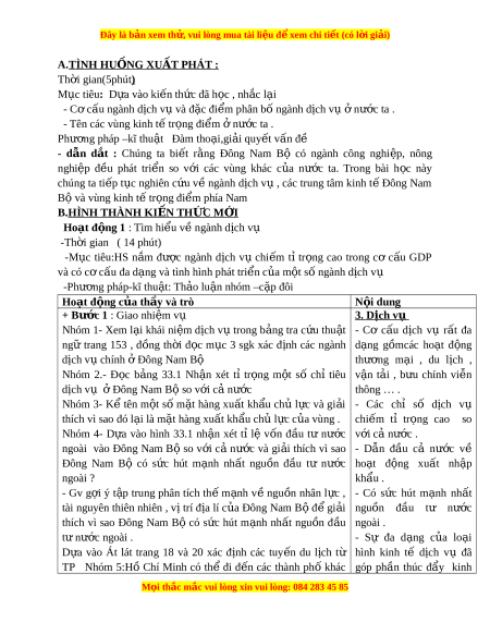 ạ và tình hình phát tri n c ể a ủ m t ộ s ngành d ố ch v ị ụ -Phư ng pháp- ơ kĩ thu t ậ : Th o ả lu n ậ nhóm –c p ặ đôi Hoạt đ ng c ộ a t ủ h y và t ầ rò N i ộ dung + Bư c ớ 1 : Giao nhi m ệ vụ 3. D ch v ị ụ Nhóm 1- Xem l i ạ khái ni m ệ d ch ị v ụ trong b ng ả tra c u ứ thu t ậ - Cơ c u ấ d ch ị vụ r t ấ đa ngữ trang 153 , đ ng ồ th i ờ đ c ọ m c ụ 3 sgk xác đ nh ị các ngành d ng ạ g m ồ các ho t ạ đ ng ộ dịch v chí ụ nh ở Đông Nam Bộ thư ng ơ m i ạ , du l ch ị , Nhóm 2.- Đ c ọ b ng ả 33.1 Nh n ậ xét tỉ tr ng ọ m t ộ số chỉ tiêu v n ậ t i ả , b u ư chính vi n ễ dịch v ụ ở Đông Nam Bộ so v i ớ cả nư c ớ thông … . Nhóm 3- Kể tên m t ộ số m t ặ hàng xu t ấ kh u ẩ ch ủ l c ự và gi i ả - Các chỉ số d ch ị vụ thích vì sao đó l i ạ là m t ặ hàng xu t ấ kh u ch ẩ ủ l c c ự a vùng . ủ chi m ế tỉ tr ng ọ cao so Nhóm 4- D a ự vào hình 33.1 nh n ậ xét tỉ lệ v n ố đ u ầ tư nư c ớ v i ớ cả nư c . ớ