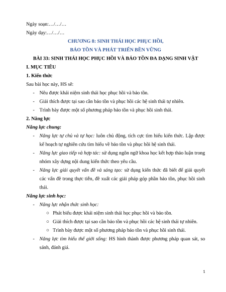Giáo án Bài 33 Sinh học 12 Kết nối tri thức: Sinh thái học phục hồi và bảo tồn đa dạng sinh vật